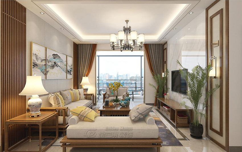 格柵背景相互呼應,水墨畫呼之欲出,陽臺和客廳用深色窗簾隔開,客廳三件套(沙發、茶幾、電視柜),既傳承著中式風格,也更加質樸、實用。富有紋理乳白色的大理石作為電視背景墻,品質和奢華彰顯無疑。桌上的燈盞附帶著濃厚的歷史氣息。綠植點綴空間,感受自然的清新。