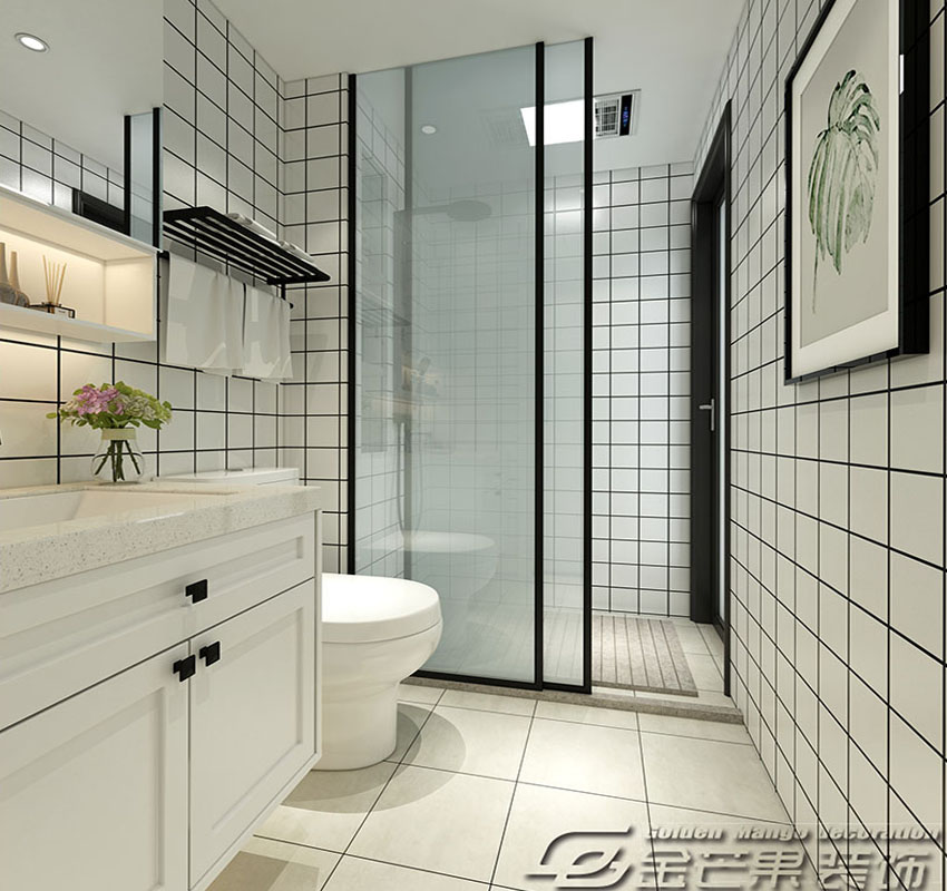 衛生間帶有強烈的空間感,用乳白色正方形的瓷磚加以黑色邊縫突出整體效果,干濕分離,干凈美觀。