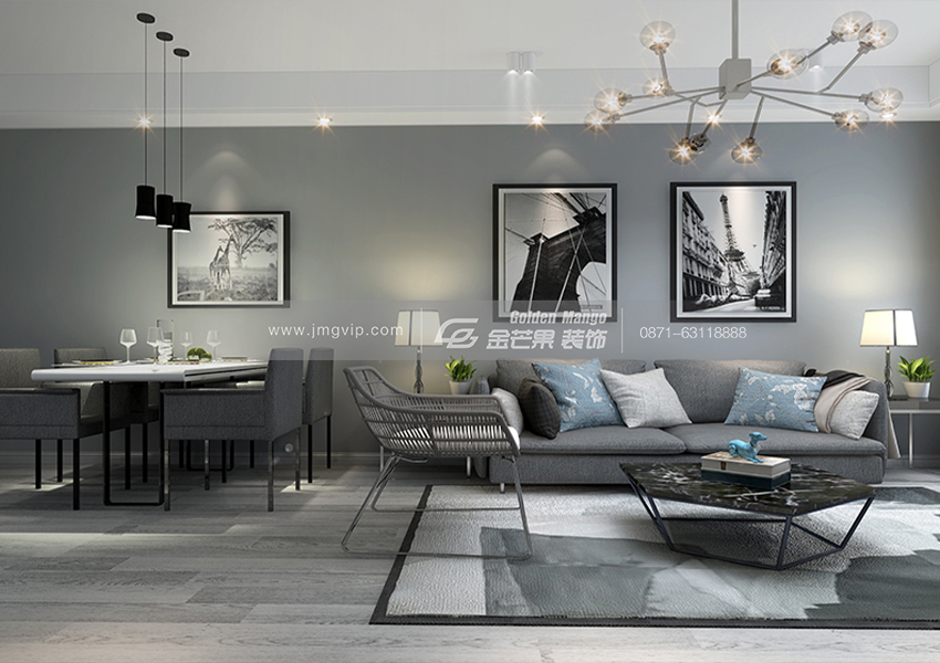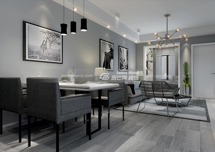 設計感十足的吊燈,為客廳增加了許多美感,餐廳用燈桶更能體現食物美妙,墻上灰色的壁畫正好契合著整體,一抹綠植升華了整體。