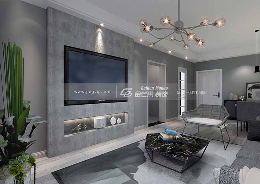 灰色的電視背景墻和黑色大理石茶幾顯得安靜和深邃,電視鑲嵌到墻體又更好的整體性,不顯突兀。