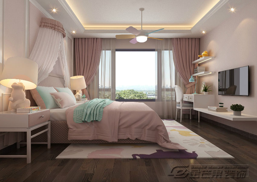 美少女喜愛的嫩粉色裝點(diǎn)著女兒房,風(fēng)扇式的吊燈鮮明無比,熟悉的巴諾克元素的椅子。相信在晚上美夢(mèng)也會(huì)有著縈繞在女兒的夢(mèng)鄉(xiāng)里。