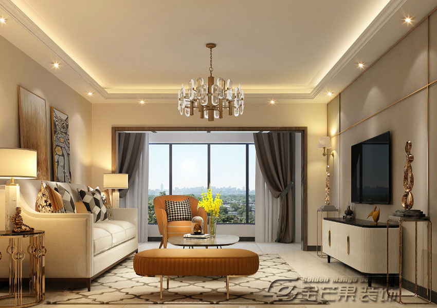 在客廳的設(shè)計(jì)上以暖色系燈光渲染整個(gè)空間,舒適溫暖。吊燈設(shè)計(jì)別具一格,搭配燈帶、射燈、壁燈。金色鑲邊的家具、飾品有著巴洛克的味道。色彩沒有復(fù)雜的搭配,色系上較為統(tǒng)一。