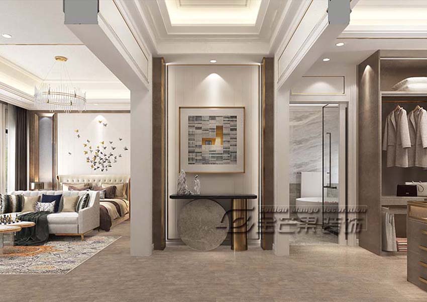 臥室極力打造一個個人的私密空間,融入衣帽間、衛生間相互之間的影響更小,空間上更寬敞,床頭墻壁上的蝴蝶,增加浪漫的色彩,吊燈充滿著強烈的設計感。