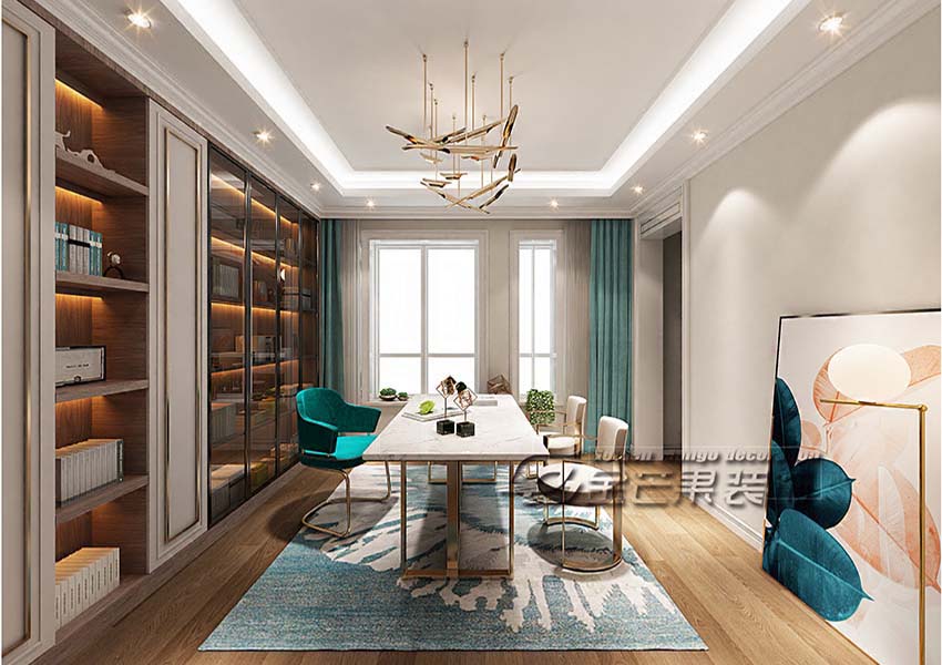 書房以清晰明了為主要主旨,燈光上減少暖色燈光的使用,更能集中精力到學習和工作中。柜體更時尚,分類更清晰,儲藏更方便。色彩搭配鮮明。