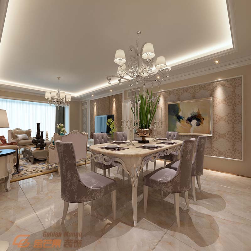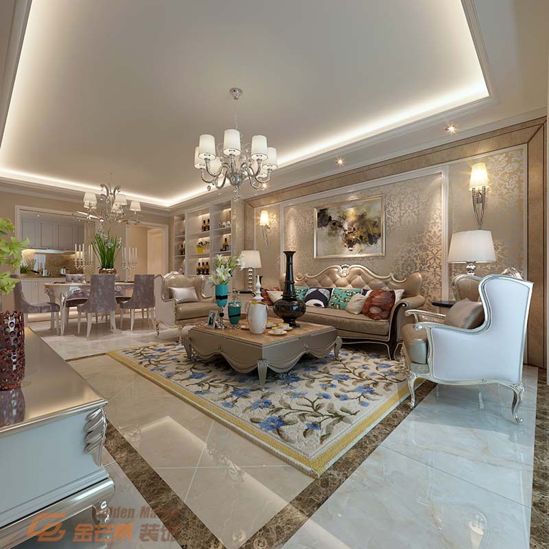 客廳客餐廳的整體性更強,相互之間有很強的聯(lián)系性,巨大的燈帶散發(fā)著整體的光,兩盞壁燈也更加富有格調(diào)。帶有巴洛克風(fēng)格的沙發(fā)增加了生活的品質(zhì),時隱時現(xiàn)泛著金色的壁紙更加奢華。
