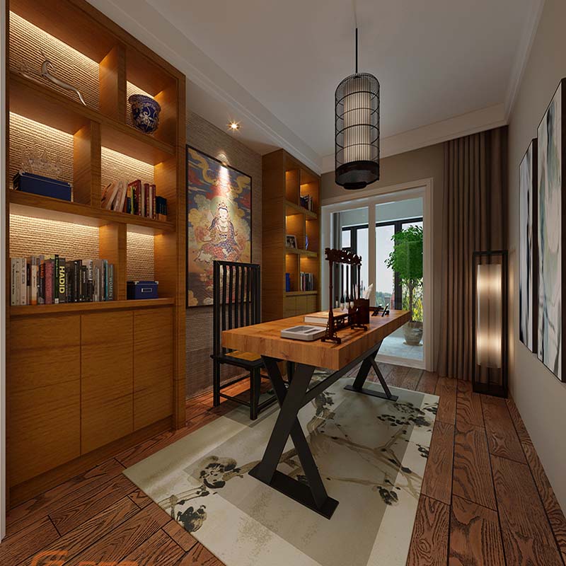 在書房的設(shè)計上著重使用中式風(fēng)格和強烈的宗教信仰,質(zhì)感更強烈,筆墨紙硯備齊,只差只差盡情揮灑潑墨之人。配有小陽臺,在疲憊之時也能遠眺風(fēng)景。