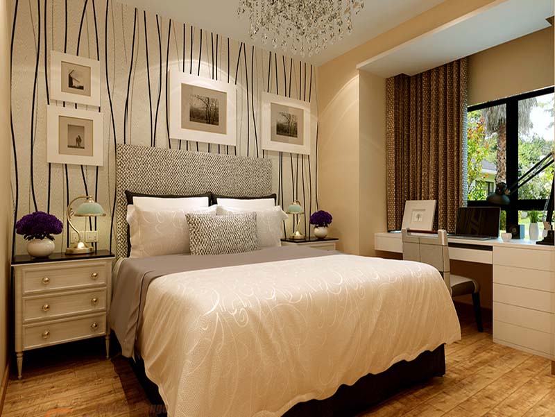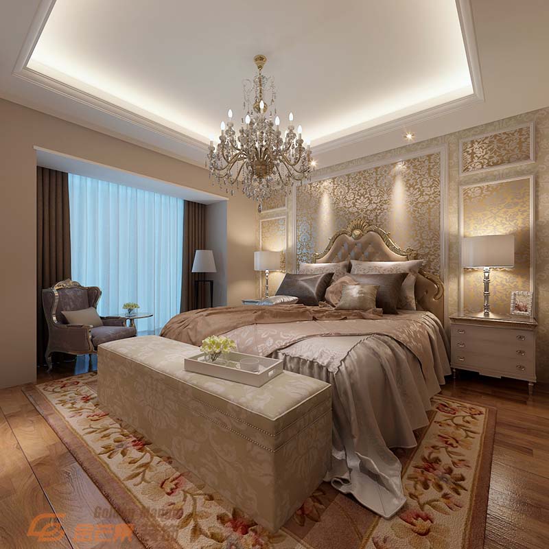 主臥則表現(xiàn)得舒適、高貴,床頭的壁紙用了和客廳一樣的壁紙,床體飽滿舒適,吊燈、燈帶、射燈的搭配提供著不同的燈光效果。