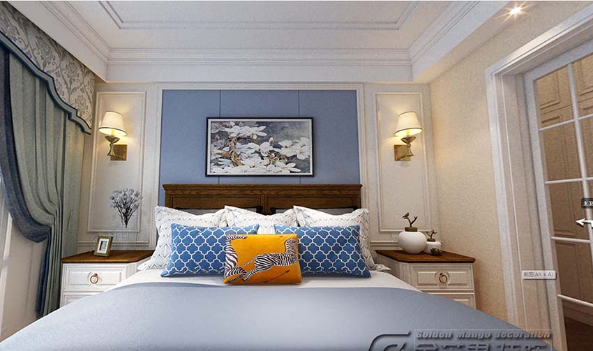 床頭運(yùn)用更加新穎的風(fēng)格,清新的淺藍(lán)色映入眼簾,壁燈怎顯得格調(diào)十足,和客廳一樣的窗簾設(shè)計。