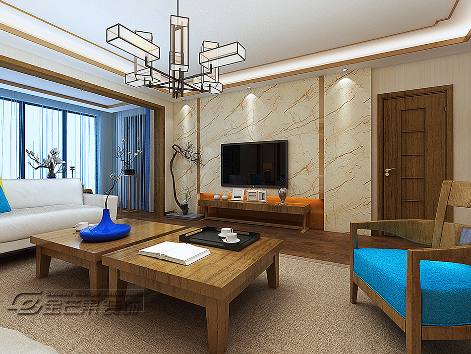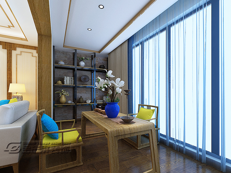 客廳,陽臺設置品茶區(qū),業(yè)主也是一個重視待客之道的人,電視背景墻絲絲的紋路,搭配旁邊的枯樹,更有風吹枯樹的意境。木質的茶幾、電視柜、地板品質十足。藍紫色的花瓶活躍著整體的氣氛,燈具的設計體現著強烈的中式風格。在線條元素的使用上也是一大亮點。