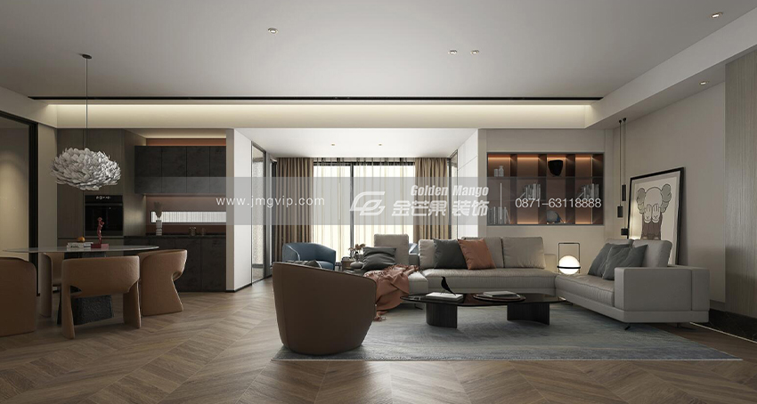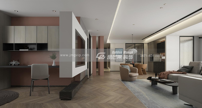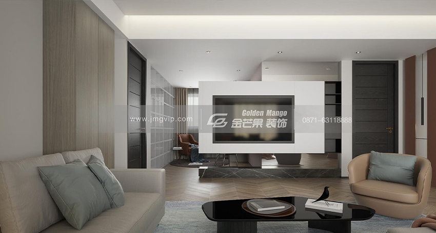 以電視背景墻巧妙隔開后面的書房、工作區,淺色系的軟裝家具,也能讓浮躁的心,沉靜不少。地板拼接成紋理豐富的形狀。舍棄了吊燈、吸頂燈等主燈設計,空間上更加的統一、視覺更加的寬敞,燈光上顯得柔和。