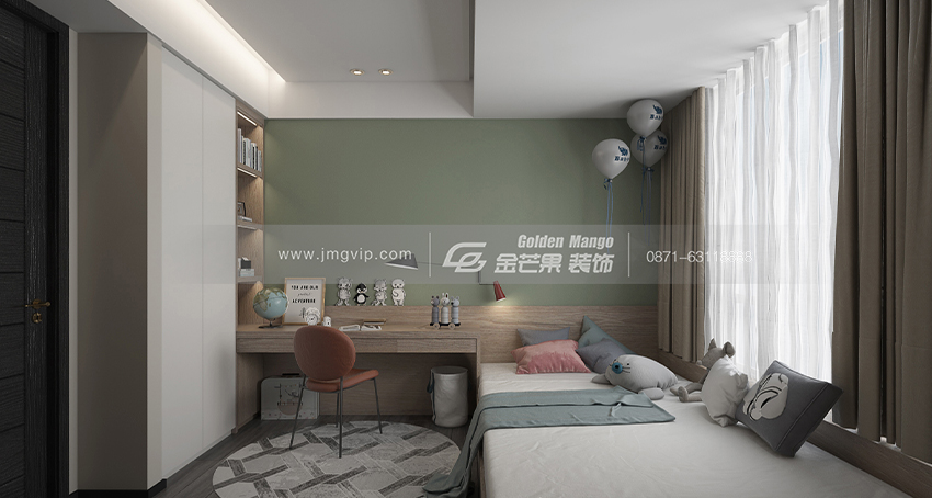 兒童房精巧布局,玩耍、休息、學習不耽誤。墻面一抹護眼的綠色加上沒有光線強烈燈的設計,顯得人性化,是設計的用心和精細的體現。可愛的布偶安靜之夜陪伴于孩子的左右。