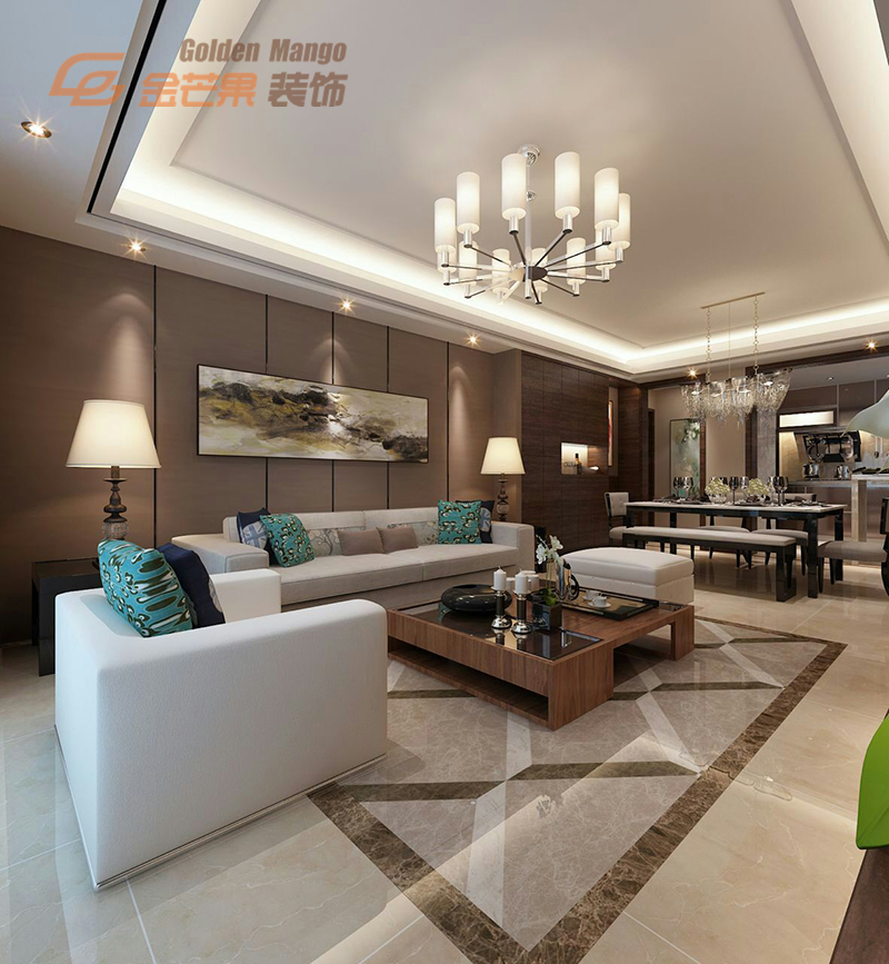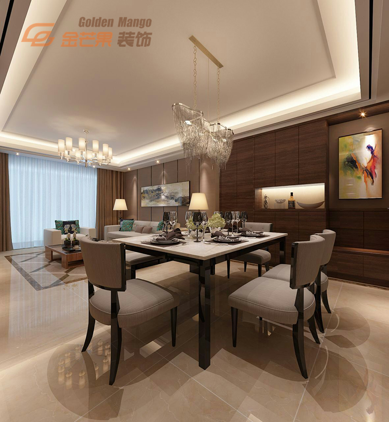 中式風格的沙發,咖啡色的背景墻。巨大的回字形燈帶為整體光照貢獻著力量,兩種風格地磚相互搭配,中式風格的茶幾。客廳和餐廳相互聯系,使用上有更好的便利性。透亮的吊燈,墻面以酒紅色的木質板材拼接。