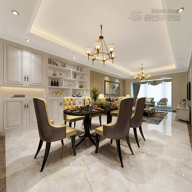 浪漫是這里最大的優(yōu)勢,凹凸有致的椅子,金色的座面和巧克力色的背面,成為了顏值擔(dān)當(dāng),黑色餐桌有小巧玲瓏的感覺。柜體的設(shè)計依舊是歐式風(fēng)格里最經(jīng)典的。餐廳和客廳隔而不斷的布局設(shè)計,讓整個空間更顯得寬敞,視覺也有很好的延伸。