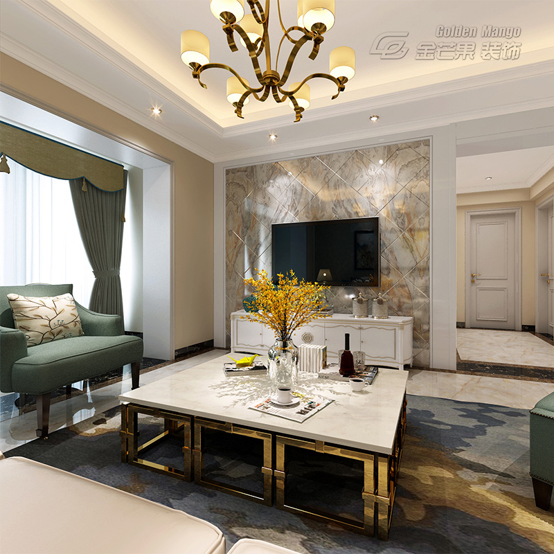 高亮的金屬透著奢華的氣息,電視背景墻顯得高貴無比,搭配上清新淡雅抹茶綠的沙發(fā),落地窗和白色的窗簾,這都是歐式風(fēng)格的體現(xiàn),以深色的窗簾做遮光,厚實、沉穩(wěn)。整體上顯得溫馨十足。