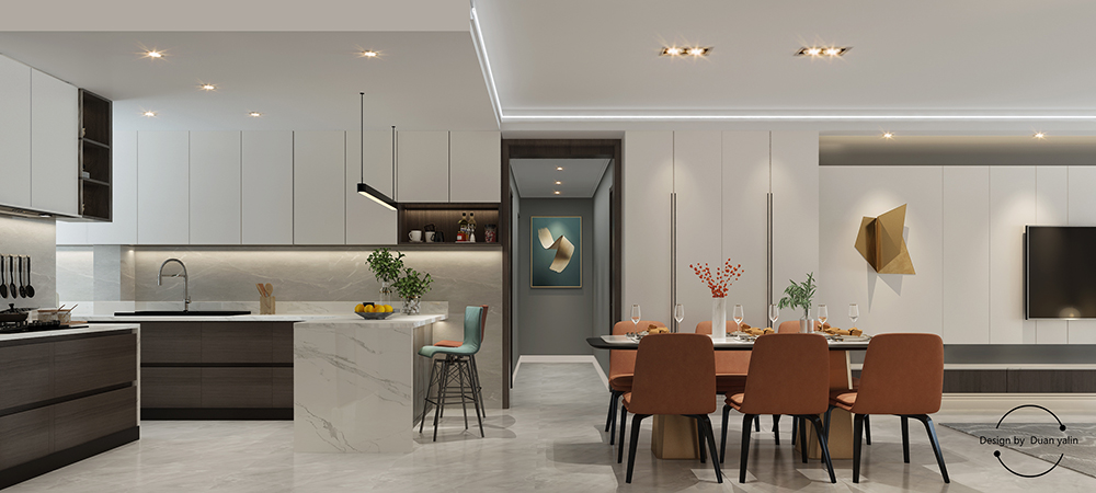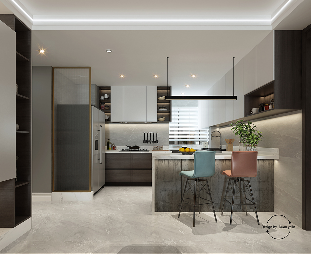 高格調(diào)的經(jīng)典黑白灰搭配亮色的餐桌椅,靈動、優(yōu)雅、時尚。爵士白石材臺面和暖灰色墻地磚形成對比,充分體現(xiàn)出整個家庭的生活品質(zhì)和積淀。