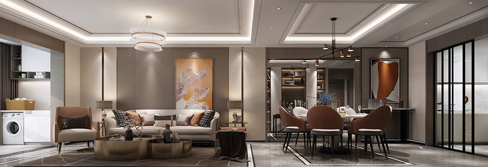 客廳沉靜優(yōu)雅的棕色,營造輕奢精致的格調(diào)。鐵藝家具充滿高級感。