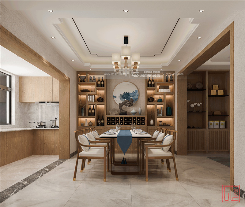 原木的餐桌椅、餐邊柜,其間點(diǎn)綴藍(lán)色山水畫,清麗婉約,炫中出素。紅酒和青瓷,一中一西,碰撞出個(gè)性獨(dú)特的設(shè)計(jì)感。