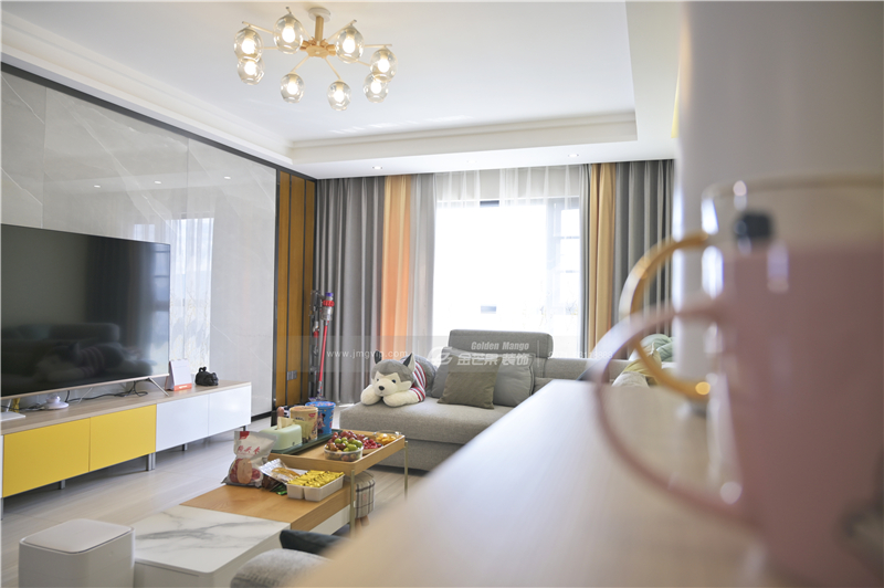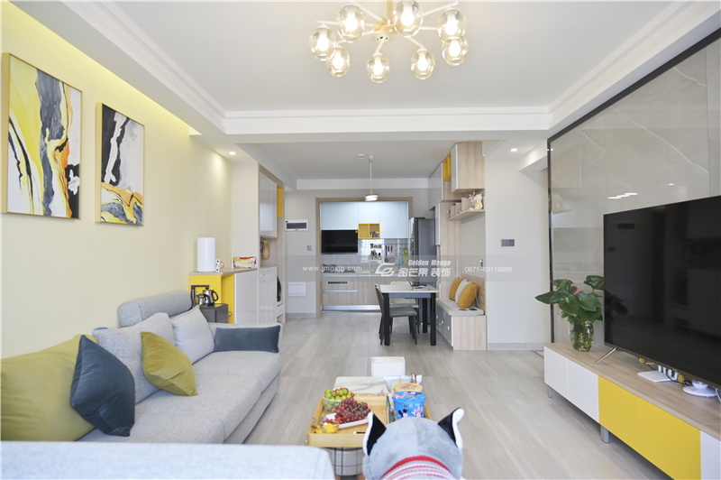 另外,這套房子是夫妻兩人的二人世界,選用了大量靚麗的色彩,比如說黃色的沙發(fā)背景墻,這樣柔和的色彩能起到讓人放松的作用,也能讓整個房間看起來更加溫馨、明媚一些,就像愛情溫暖、美好的模樣。