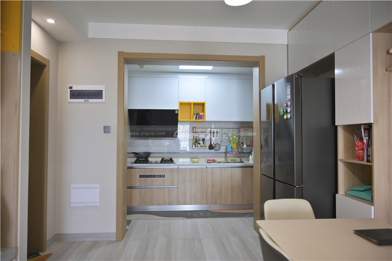 很居家的廚房,淺色系溫馨、干凈的空間。吊柜增加大量收納空間,黃色格子和客廳呼應(yīng),這樣的設(shè)計(jì),讓房間隨處可見明艷的顏色,空間也變得生動、有趣起來了。