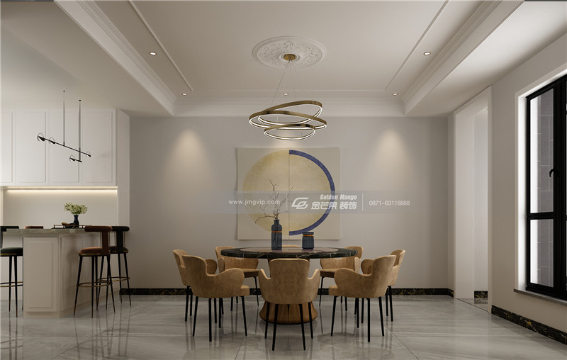 大面積的留白體現中式的質樸與簡雅,頗有“禪意”的意境。餐桌椅和吊燈選用的是比較具有現代感的樣式,簡約的格調和中式氛圍中和,碰撞出別樣的個性與精彩。