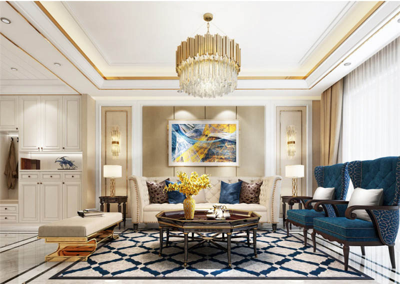 整體以淺色為主,深色為輔。藏藍色的座椅高貴、優雅,和鐵藝的家具搭配相得益彰。地毯和座椅搭配的恰到好處,營造雍容華貴的感覺。電視背景墻豐富空間層次,水晶吊燈增加奢華感。