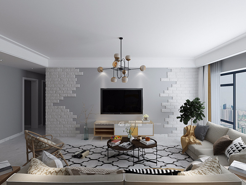 沉靜的顏色搭配防磚的電視背景墻,凸顯質樸的氣息,但因為選用的是白色的色調,高級感更顯。地毯花紋更加靈動,和沙發(fā)背景形成了一個呼應。