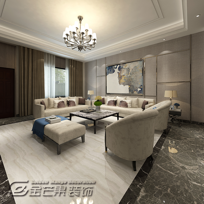 整體空間以黑白灰為主色調,簡約大氣,舒暢有質感,搭配大理石的地板,典雅的燈飾和優雅花紋的抱枕,整個空間既舒適又大氣。