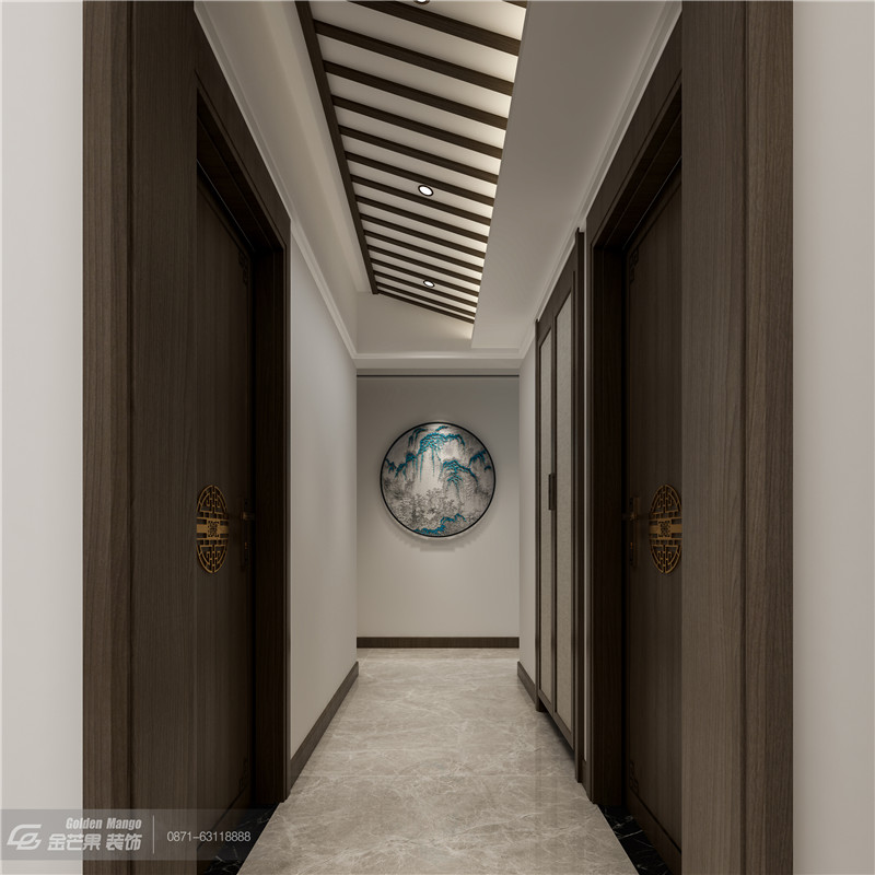 長步廊,寬窄巷,獨特的斜頂設(shè)計,兩邊的門點綴金色的中式圖案,將傳統(tǒng)的中式景觀鐫刻進家里,自成一景。