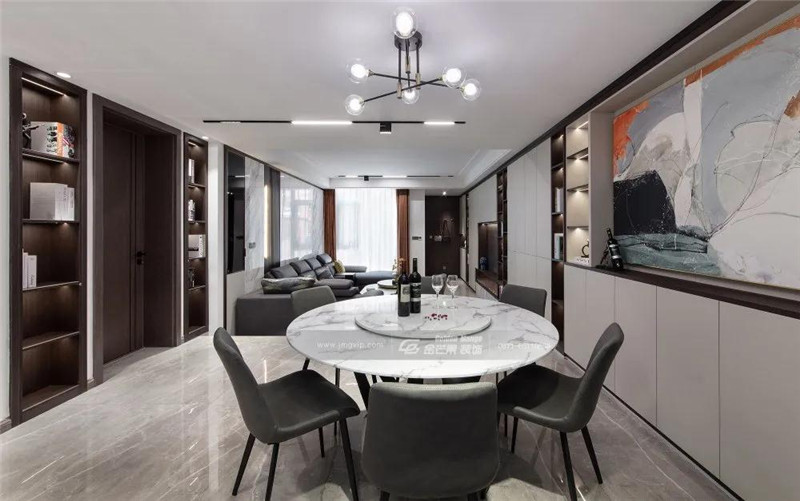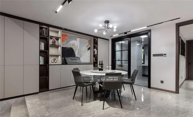 大理石臺面的餐桌和柜體形成顏色上的呼應,深色的餐座椅在淺色系的空間里形成明度上的呼應。頂面可移動的軌道燈可以將光源隨時變換,體驗感更佳。