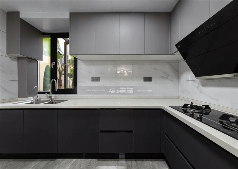 廚房設置玻璃推門,空間更通透,增加精致感和時尚感。柜體整體是烤漆深灰色,便于打理,且是經典不易過時的顏色。大量柜體嵌入冰箱、烤箱、洗碗機等電器,提升家居品質。