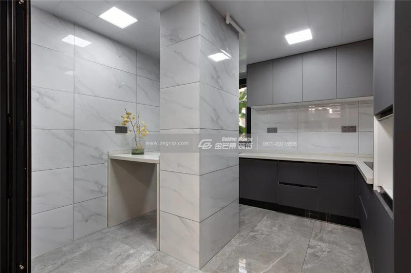 吊頂側邊細節處理,與柜子的鋼條和大理石的分縫產生聯系,整體感和空間呼應感更佳。