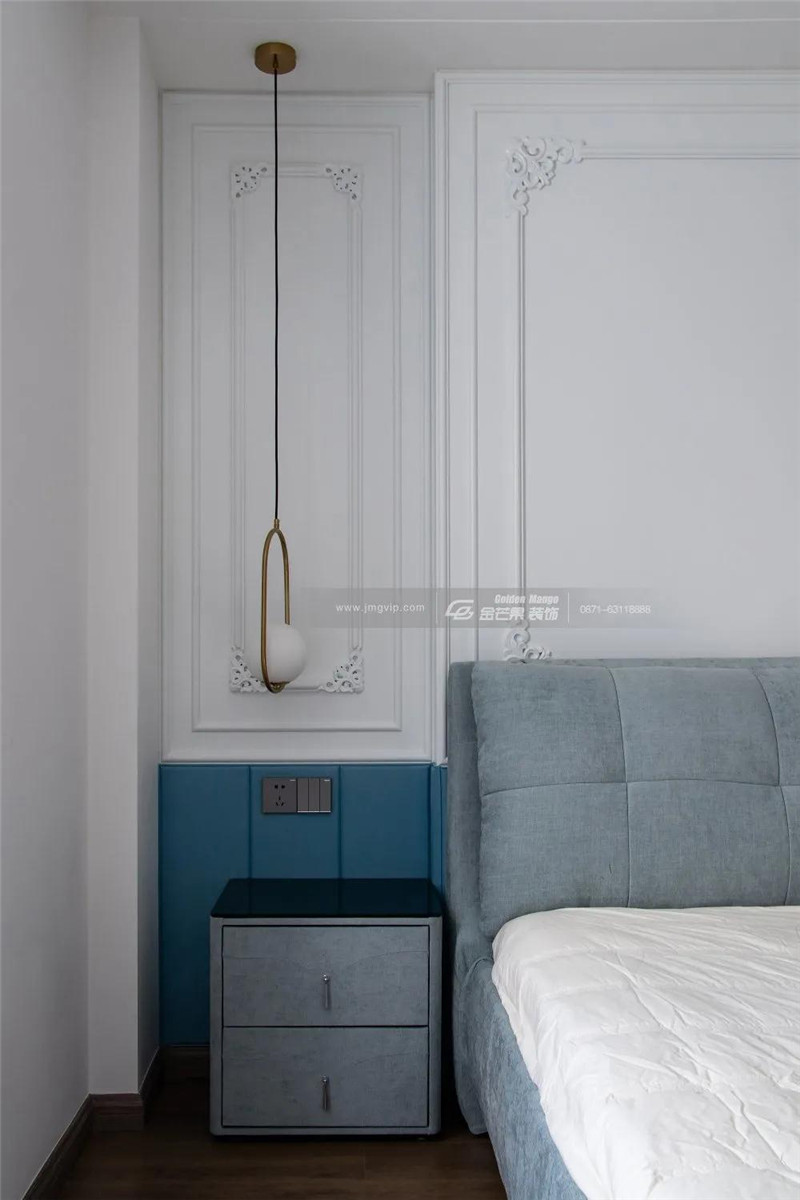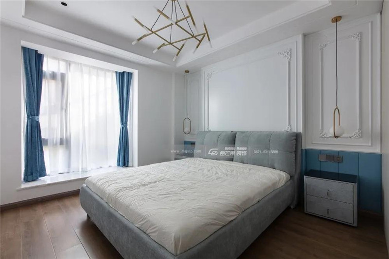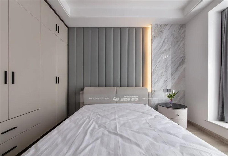 主臥背景墻利用法式線條和硬包做處理,墻面的雕花設計為空間注入浪漫的氣息,生活固然平淡,但儀式感也很重要哦。