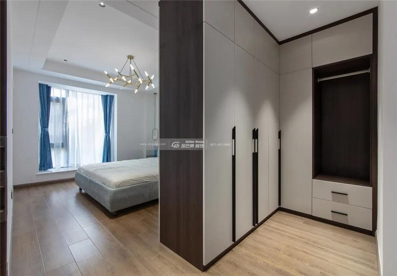 連接主臥的衣帽間,既可以做到區域的劃分,又可以放置大量的衣物,滿足業主一家儲物的需求。