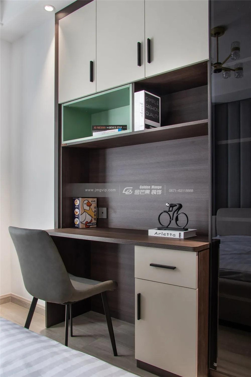 床頭背景墻采用硬包加石材的處理,在輔助光源的加持下,時尚、精致感俱佳。木質柜體加上灰玻,又酷又時尚。一邊是孩子做作業的區域,一邊擺放一些小擺件,好看、實用。