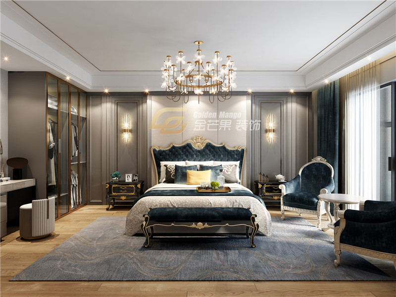 宮廷皇室般的儀式感,藍色絲絨和雕花展現貴氣,床頭背景墻華麗典雅。整體運用了很多造型感比較強的裝飾,卻不顯張揚,細膩的品質感讓屋子充滿了華貴的韻味。