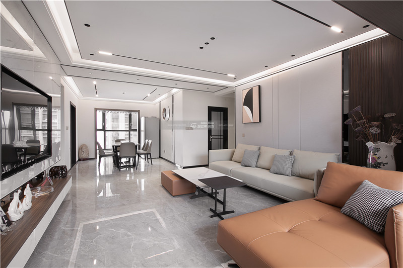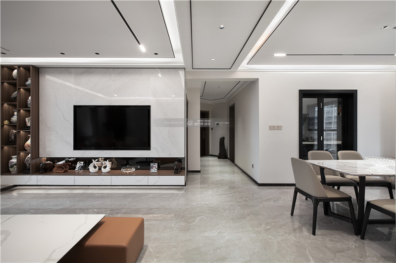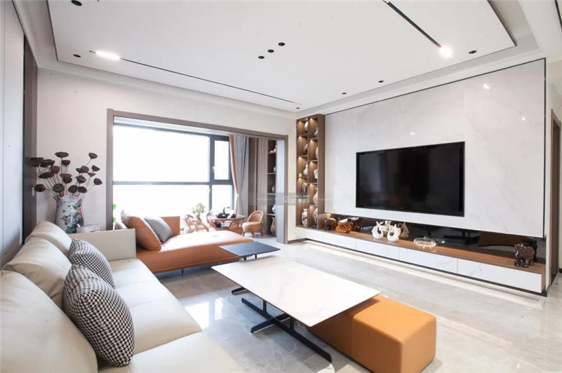 大理石電視背景墻,黑色線條點(diǎn)綴,整體感很強(qiáng)。木質(zhì)柜體的溫度讓疲憊的夜歸人得以安撫,溫暖的光線下,是心底那一束尋求溫馨的光。