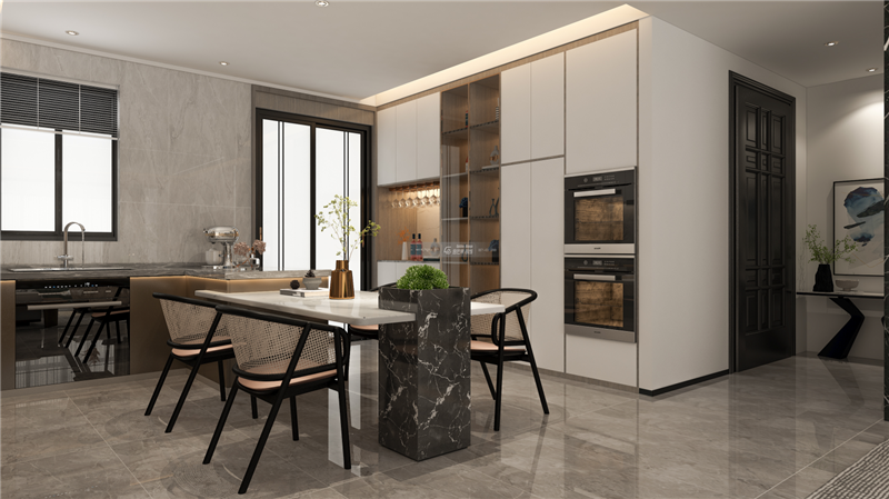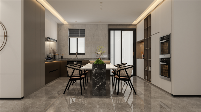 簡潔、大氣的氛圍,白色醞釀出高級(jí)的質(zhì)感,加入一些金屬線條增加精致的高級(jí)感,讓餐廚空間亦動(dòng)人心。