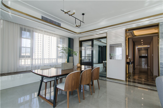 滿屋大面積白色,簡約、干凈,吊頂上用金色的線條點綴打造輕奢感,這種奢而不膩又帶點小清新的味道,清純又迷人。 兩面超大落地窗,視野超好,軟裝上搭配仙氣飄飄的白色紗簾,微風簾動,窗外景色盡收眼底,太愜意了。