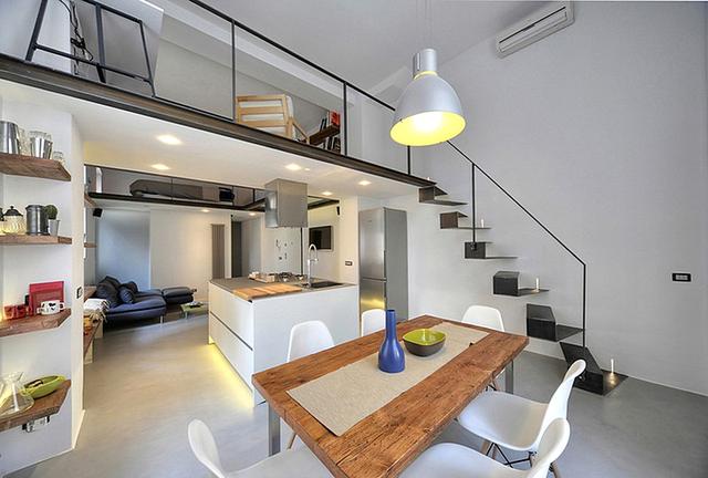 躍層樓梯的設計首先不能為了光節省空間而失去樓梯原本的功能,它需要滿足流暢的通行,樓梯踏步的寬高要符合尺寸。在整個設計中安全性也是需要注意的,堅固、防火、稱重量都要符合基本的要求,而樓梯欄桿的鏈接、扶手連接都要特別的穩固。最后并根據樓梯口走向和樓下空間布局,靠墻邊的樓梯最適合躍層小戶型。