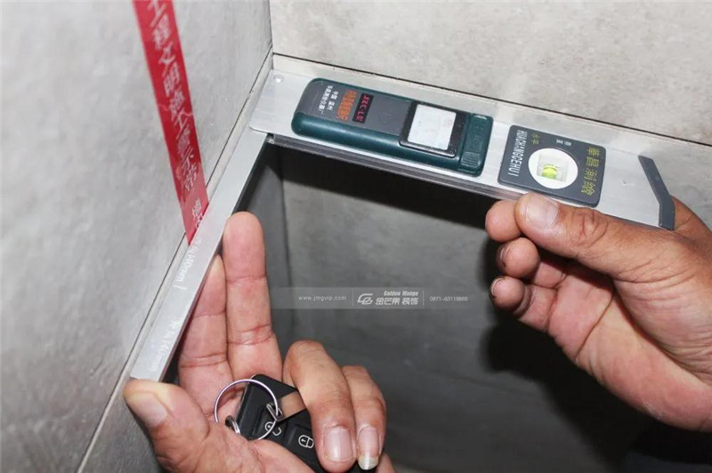 專業(yè)儀器角尺對(duì)墻磚的陰角進(jìn)行檢測(cè),以求達(dá)到規(guī)范的角度要求,更加方便后續(xù)的成品安裝。