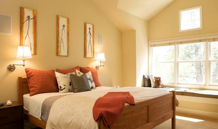 臥室光線以柔和、暖色調為主。可用壁燈、落地燈來代替室內中央的頂燈,壁燈宜用表面亮度低的漫射材料燈罩,床頭上方的墻壁,裝一盞茶色刻花玻璃壁燈,具有古樸、典雅、深沉的韻味。床頭柜上可用子母臺燈,如果是雙人床,還可在床的兩側各安一盞配上調光開關的燈具,以便其中一人看書報時另一人不受光的干擾。